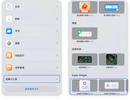 2、在组件添加页面向下滑动,找到“经典小工具”选项,点击进入后,在WidgetHub的组件列表里,选好合适尺寸,然后点击或拖到桌面。