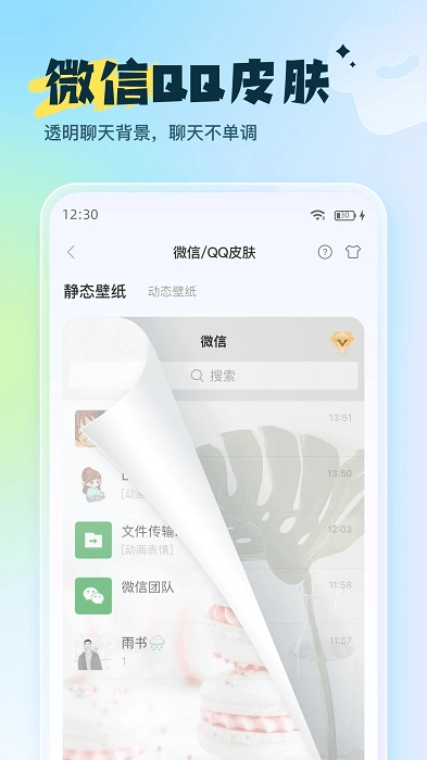 4、提供微信聊天背景个性化定制功能,海量静态及动态皮肤素材任你挑选,轻松让你的社交软件呈现全新风貌。