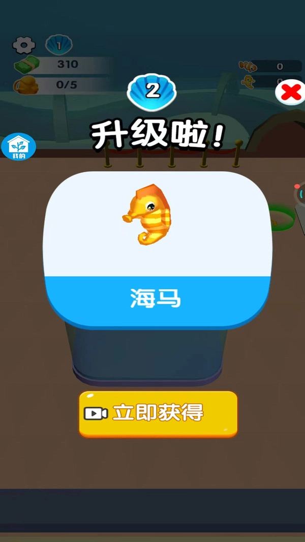 2.点击“立即获得”按钮观看视频后可立刻获得新鱼种,无需等待,适合想快速丰富水族馆的玩家使用。