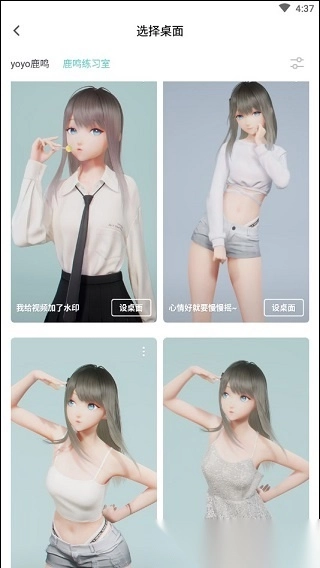 2. 当你打开软件,鹿鸣便会从屏幕下方探出头来,带着一脸天真望向你。此时,点击“唤醒”,她就能常驻在你的手机桌面上。在这里,你可以自由挑选不同的服装、风格以及配色,随心所欲地搭配出专属于你的屏幕画面。只需轻点界面右下角的“选桌面”按钮,就能进入“鹿鸣练习室”板块。在这个板块中,有鹿鸣的舞蹈作品以及日常片段,你可将它们设置为动态壁纸。不仅如此,该板块的内容还会持续更新,每次都能让你领略到鹿鸣不一样的魅力。