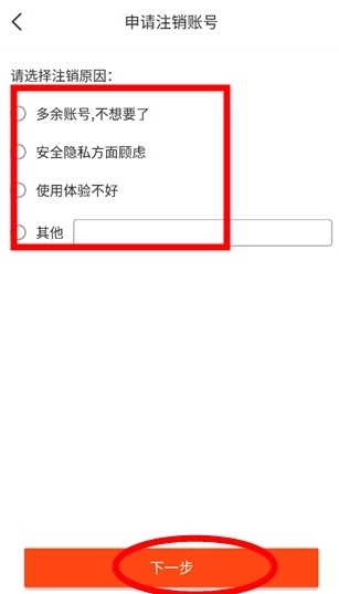 3、按照页面给出的提示,挑选注销原因,确认无误后点击“下一步”,从而完成账号注销操作。