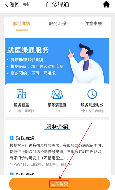1、打开"首页",进入"门诊绿通'',点击"立即提交"。