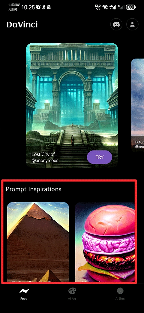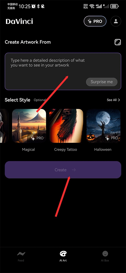 3、点击后将跳转至AI Art界面,随后在上方文本框内输入您期望在艺术作品中呈现的详细描述,再点击“create” 。