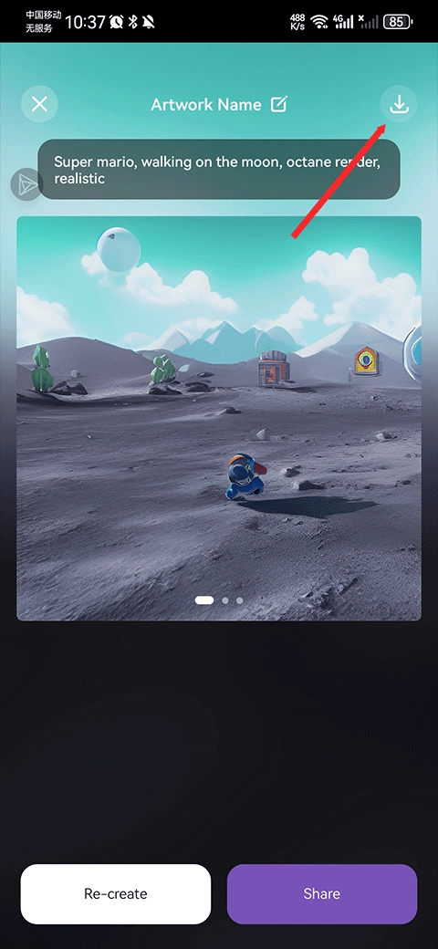 5、最后,软件便会为你生成AI图片。若你对生成的图片感到满意,点击右上角按钮,就能将图片保存至相册。