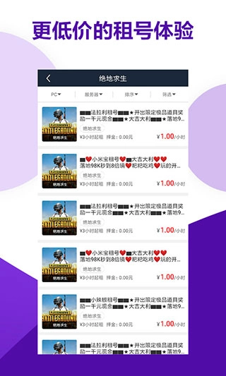 2、请进入主页或者租帐号页面,在图示的筛选栏里选择“购买”,接着依据你对帐号的要求挑选其他筛选条件,筛选栏下方会展示相应的筛选结果。点击即可打开详细信息页,查看商品具体信息。