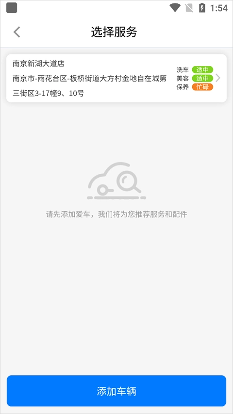 2、进入新打开的页面,系统会自动匹配用户周边的洗车门店。若用户希望更换门店,点击门店信息,自行挑选门店即可。选定门店后,点击【添加车辆】。
