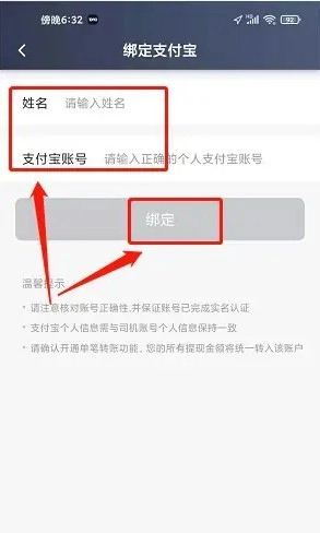 请进入绑定支付宝的界面,在此界面中输入姓名以及支付宝账号,随后点击“绑定”按钮,具体操作位置可参考下图。