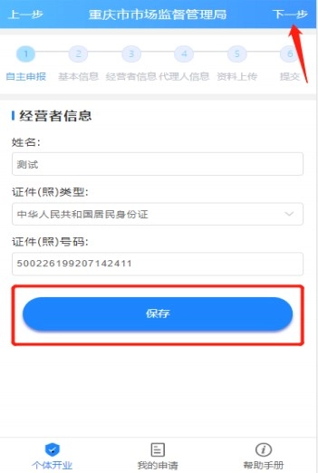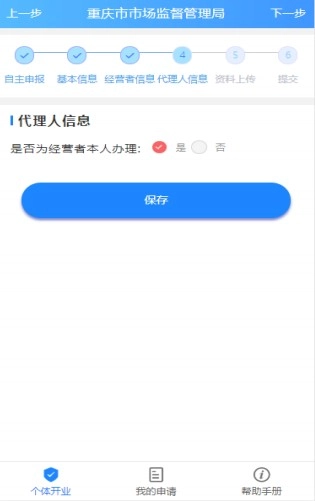是否为经营者本人办理,点击【保存】,下一步;