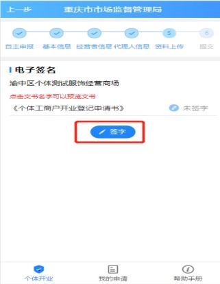 若当前经办人就是经营者本人,直接点击签字,便会跳转到如下图所示界面,在此界面再次点击签字,完成后续签字操作即可。