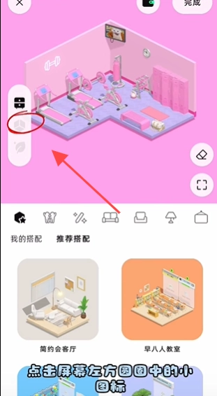 7、接着,可在刚安装好的地板上点击框选的小刷子按钮,随心所欲地摆放自己心仪的家具,以此实现空间的扩大。