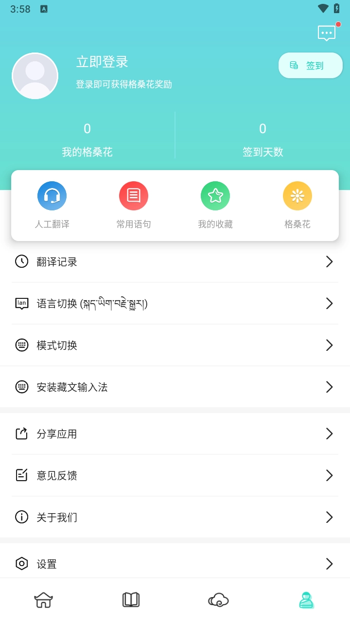 5、在末尾我的这一栏中,能够查看翻译记录、进行语言切换、安装藏文输入法以及请求人工翻译等操作。