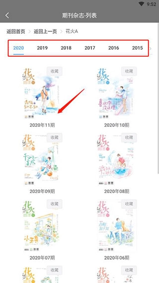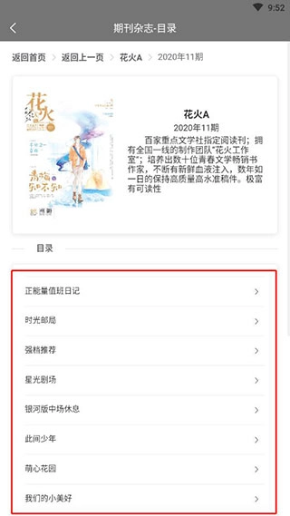2、要是在推荐里看到心仪的期刊,点击即可进入选择观看。例如进入《花火》,就能挑选自己想要的内容。
