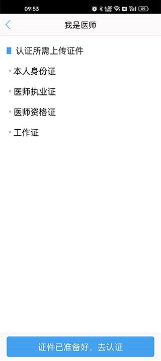 4、最后完成选择后,上传本人的身份证、医师执业证、医师资格证以及工作证即可。