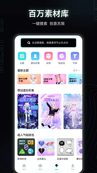 -具备丰富的素材库,涵盖服装、贴纸、文字滤镜等各类素材,用户能够通过一键搜索轻松获取并加以使用。