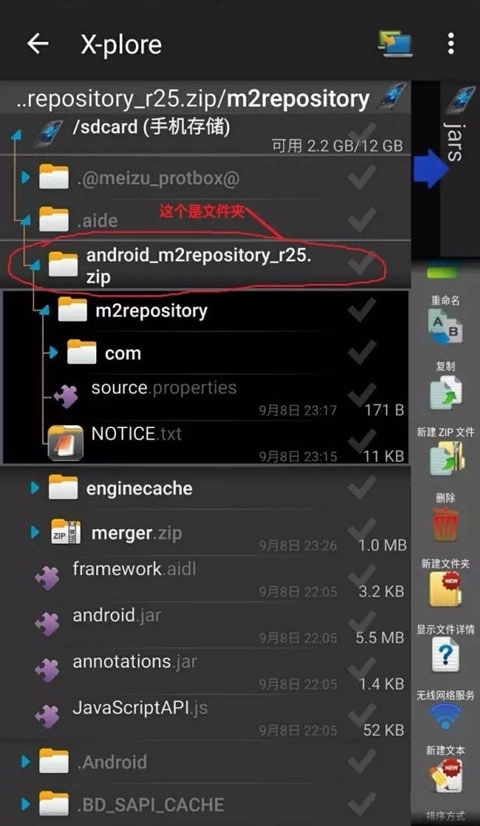 第一步,在本站成功安装aide汉化版,安装结束后便能够开展基本的安卓开发工作。要是你想使用安卓扩展库的相关功能,那么还需要android_m2repository_r25.zip这个扩展包,具体操作步骤如下:
