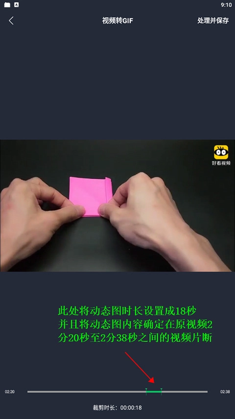 3、在新打开页面底部的进度条处,用户能够通过在左右两侧移动进度指针,对动态图的时间及其图片内容进行设置,完成设置后,点击右上角的【处理并保存】。