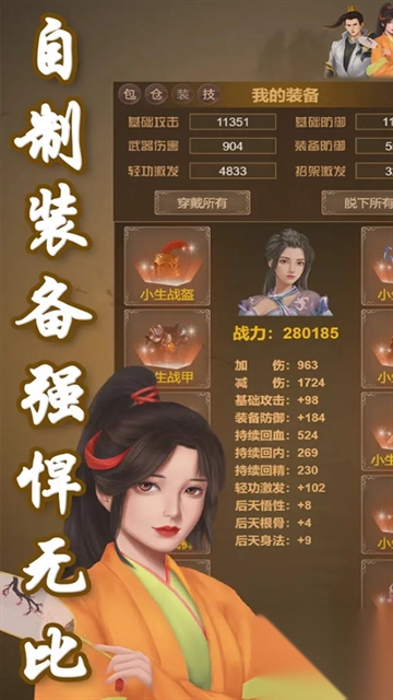 2、上百种武功随你挑选,想成为大侠并非难事。要知道,这世上没有天生愚笨之人,只有不愿努力的懒人。