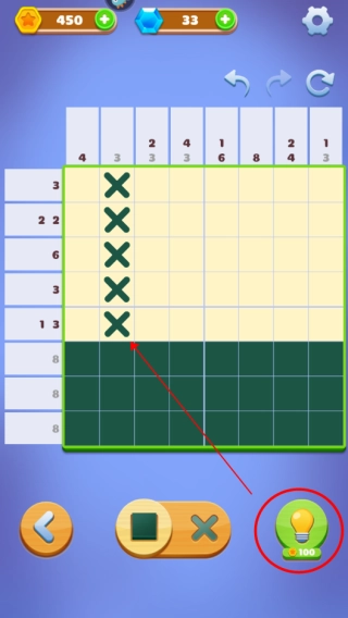 2、轻点下方的小灯泡图标,当玩家完成行/列的涂抹后,会自动打上×,以便玩家开展后续的涂抹操作。