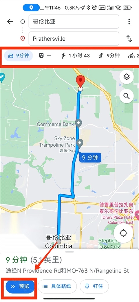3、完成搜索后,系统会为你展示驾车、公交地铁、步行、骑行这四种路线规划方案。你可依据自身需求进行挑选,选定合适方案后,在路线界面点击下方的“预览”按钮。