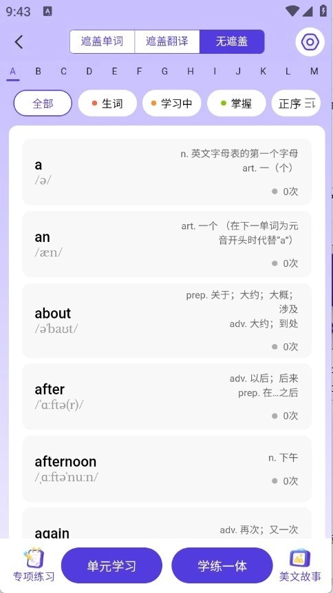 3、为用户带来极致使用体验,定期对单词库进行更新,助力用户轻松学习英语。