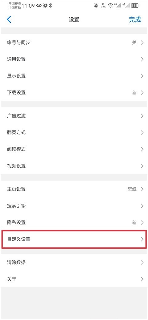 3、在设置页面点击自定义设置