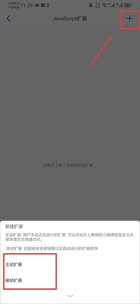 5、进入后点击右上角+号,然后选择主动扩展或被动扩展