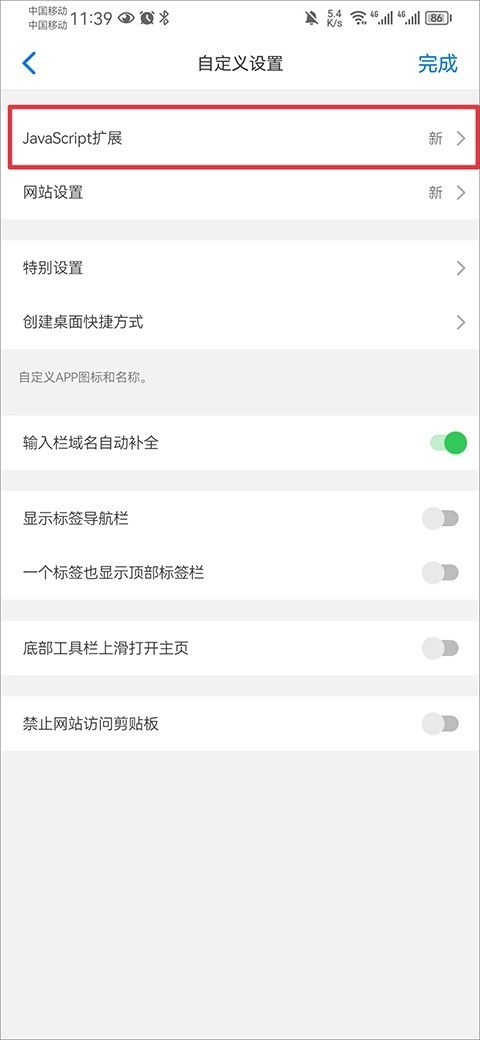 4、然后在自定义设置页面中点击javascript扩展功能