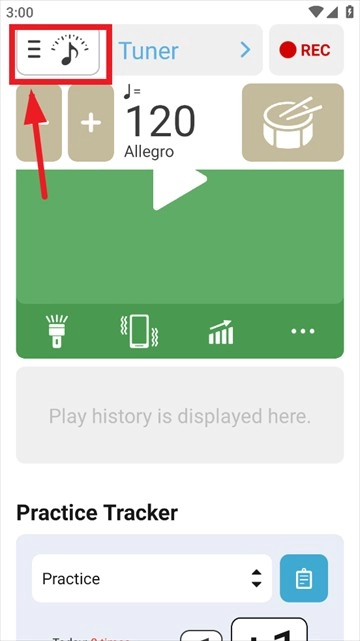 1、第一步,打开本页面的调音器与节拍器,进入首页后,点击左上角的【三横图标】。