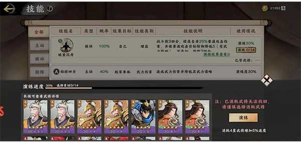 技能与武将一样,都是这个游戏的核心。武将自身属性决定的是武将的极限,而技能则能提升武将的上限。而且技能在战斗中也发挥着决定性效果。