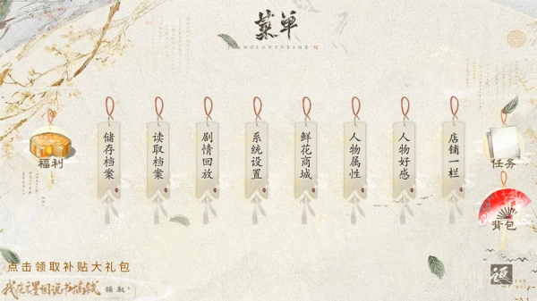 3、通过【储存档案】与【读取档案】来管理进度,利用【剧情回放】重温情节,借助【系统设置】调整参数;在【鲜花商城】购买道具,从【人物属性】和【人物好感】中了解状态。