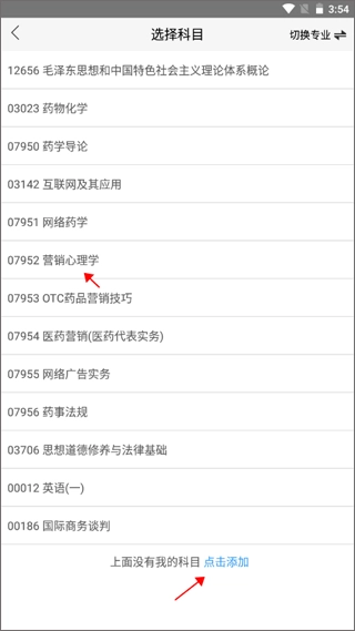 4、点击某一专业后,页面会跳转至科目选择界面,此时你需挑选想要练习的科目。若没有找到自己的科目,可点击下方的“添加”按钮。