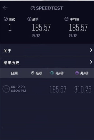 4、点击首页右上角的三条杠,可以看到我们每次测速的结果,测试的时间都有显示,这个还是很方便的
