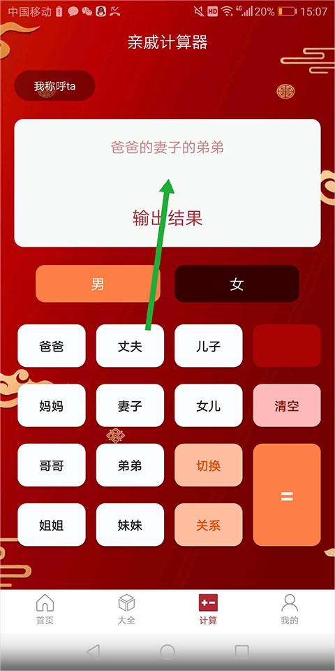 2、首先,我们要选定自己的性别,之后点击下方任意亲戚称呼。你既能够连续多次点击同一个称呼,也可以连续点击不同的亲戚称呼。像下图绿色箭头所指区域,就是连续点击了三个不同的亲戚称呼。