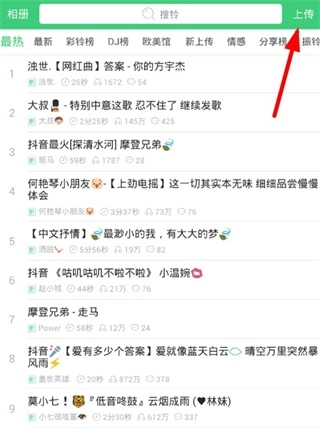 1、当然首先要进入铃声多多的主界面中,点击首页里右上角的【上传】。
