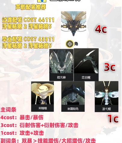该角色源自黑海岸阵营,身旁常伴随象征光明与黑暗的双羊形象。其性格开朗外向,但内心深处暗藏着对黑暗的强烈恐惧。在游戏初期,可选择紫鸟(cost3)作为主要声骸。当完成支线任务后,若获取到摩托声骸,建议优先替换,以此提升战斗节奏感。 在主词条搭配上,cost4的声骸优先选择双暴词条,cost3的声骸适配火属性加成词条,而cost1的声骸则以攻击百分比词条为最佳。过渡阶段的配置可采用44111组合,最终毕业配置推荐43311。副词条的选择顺序,从高到低依次为双暴、攻击百分比、普攻加成、小攻击,此养成路径适用于追求稳定输出的火属性角色。