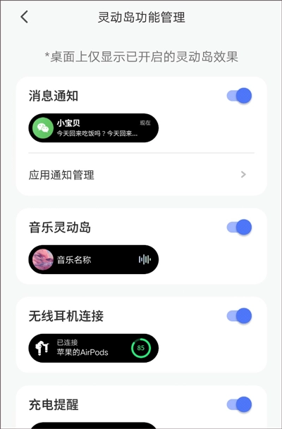 3、灵动岛管理具备多种功能效果,涵盖消息通知、音乐灵动岛、无线耳机连接以及充电提醒,用户可按需开启。