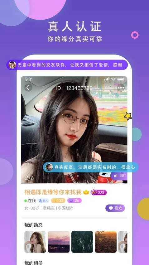 所有用户经过实名认证,随时都能在线互动,打造了一个安全的交友环境!