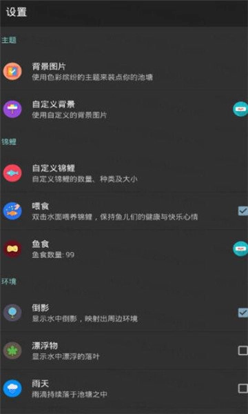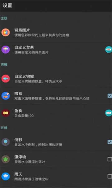 鱼池这款手机动态壁纸超棒,趣味性十足。你能够给锦鲤投喂食物,添加水草,增添水纹等,让壁纸呈现出更为逼真有趣的效果。感兴趣的朋友们,赶快行动起来尝试一下吧!