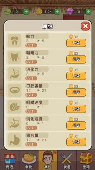 4、点击下方的属性按钮,便能花费金币来提升角色的各类属性。属性数值越高,角色所能消耗的食物量也就越多。