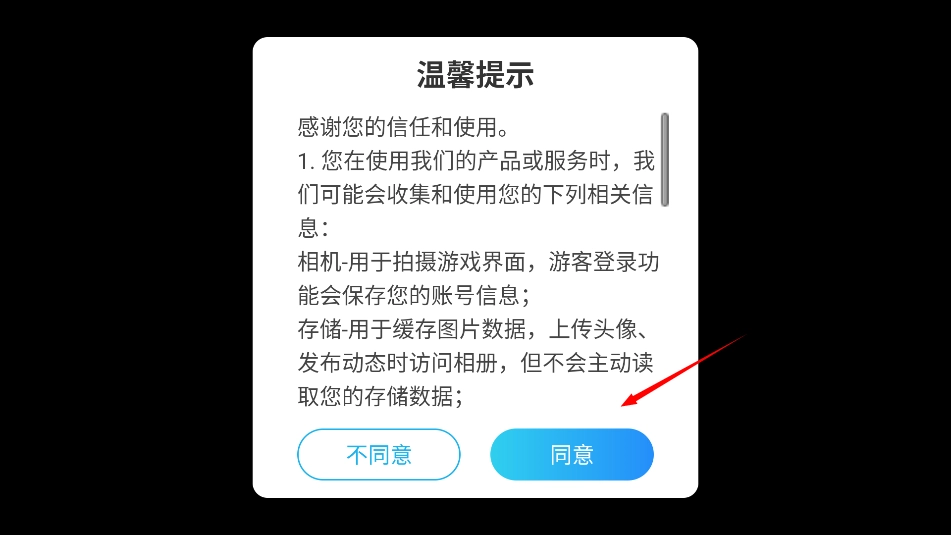 首先打开游戏后同意相关的使用权限