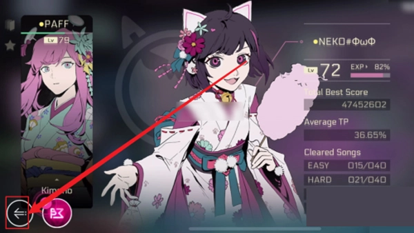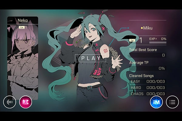 iM按钮旁有个白色按键,既能查看所选角色的详细信息,像已通过的曲目总数,也能对游戏的各项参数进行调整,例如音量大小、拍点尺寸和语言设置等。
