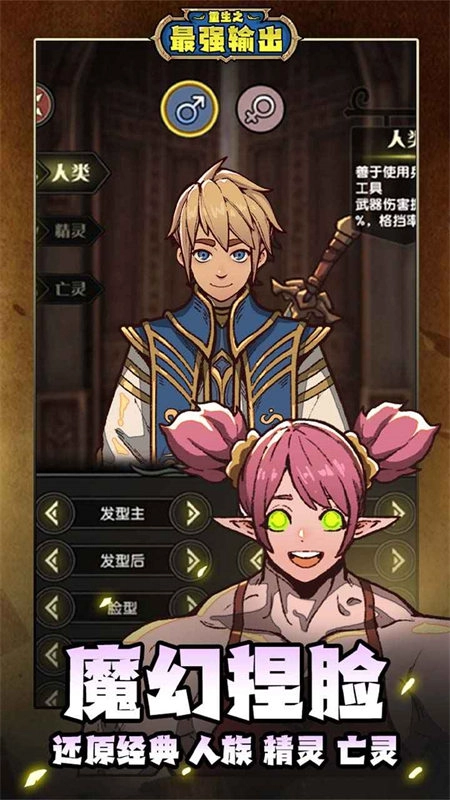 游戏里设有3个种族可供选择,人类种族的特性是增加主属性,精灵种族能提升急速属性,亡灵种族则会强化暴击属性。刚开始游玩时,推荐选择战士职业,或者也可以考虑元素法师职业,不过无论选哪个,都得能扛住BOSS的攻击才有机会顺利通关。