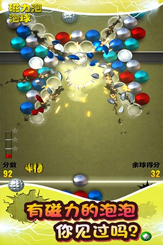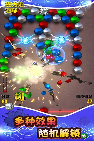 这是一款让人玩起来就停不下手的三消类休闲游戏,对于熟悉泡泡龙玩法的玩家来说,上手会非常轻松。它在经典玩法的基础上,巧妙地融入了磁性、惯性等物理特性,以及炸弹、闪电、冰冻等特效元素,让游戏过程充满了物理互动的乐趣。游戏采用关卡制设计,提供了丰富的挑战内容。玩家需要通过发射带有磁性的小球,将三个或以上同色的球连成一线来消除它们。你还可以灵活切换待发射小球的颜色,以便更精准地瞄准和消除,从而获得更高分数并通关。当你闲暇无聊时,不妨来试试这款游戏,它不仅免费无内购,还能充分锻炼你的策略思维和反应能力,感兴趣的朋友可以亲自体验一下!
