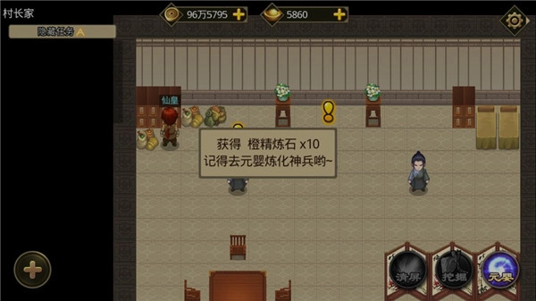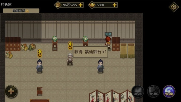 右上方的柜子里放着一块紫仙御石,右下方的罐子里则装有三千枚铜币。
