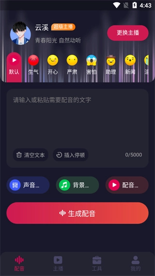 天天配音能为大家提供最及时的配音服务,无论哪种语言,都能在这里找到并使用。软件里有各类不同的配音模板可供使用,用户只需输入一段文字,系统就会自动生成对应的配音语音,另外还有各种有趣的背景音乐(bgm)可以搭配使用,有需求的用户赶紧来体验吧。