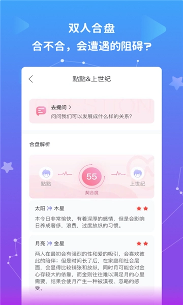 3、特有的开放性合盘缘分评分功能,能够对两人的缘分展开数字化评估,并且会公开展示评分的各项细节,让你不仅清楚结果,还明白其中的缘由。