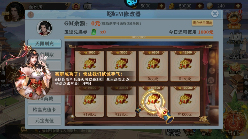 4、玩家可以打开金手指,点击打开金钱包游戏充值系统,之后就可以拿gm钱包养角色了;