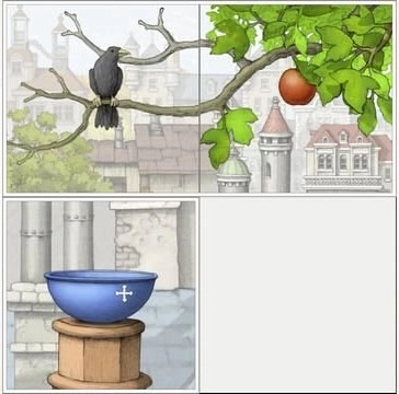这一关的通关步骤是:先把左上角那只乌鸦踢下来,再将右上角的苹果弄到碗里,把两者衔接起来就能触发机关。之后引导孩子往前走,调整好门洞的整体位置,让他顺利进入花园。