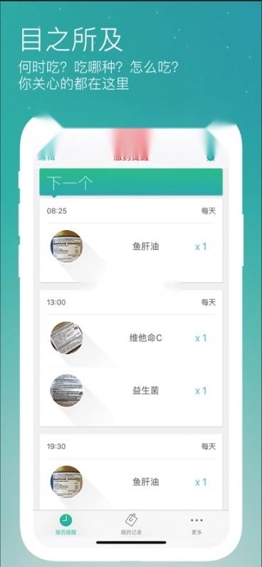 核心功能包含服药提醒与服药记录功能,并且支持查看家人的用药记录。