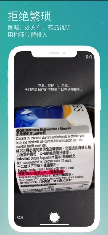 2、药品说明、医嘱、处方单一键拍照保存,无需繁琐输入